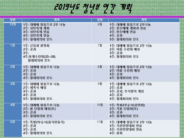 2019 청년부 연간계획 및 교사 페이지 정보 작성자 관리자 작성일19-07-23 10:15 조회7,093회 댓글0건 다음글 목록 본문 2019 청년부 연간계획 및 교사 댓글목록 등록된 댓글이 없습니다. 다음글 목록